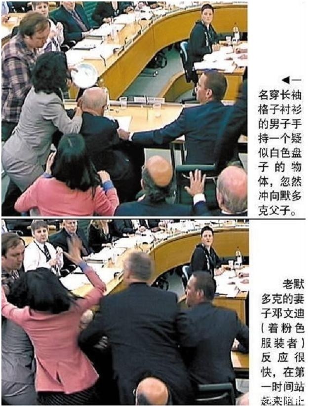 一名抗议者突然冲上前,手持剃须膏罐试图袭击年迈的默多克。
