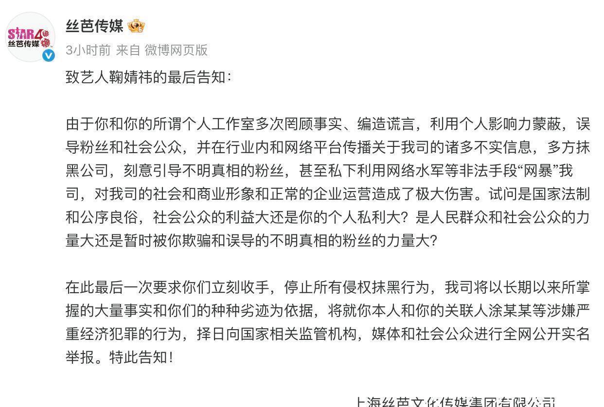 声明措辞尖锐,直指多项 “劣迹”在这份引发热议的《最后告知》中,丝芭传媒毫不留情地列举了鞠婧祎方的 “五大罪状”:罔顾事实编造谎言、利用个人影响力误导粉丝与公众、在行业内和网络平台散布公司不实信息、刻意引导粉丝抹黑企业,甚至被指动用网络水军等非法手段对公司实施 “网暴”。声明中接连抛出两个灵魂拷问:“是国家法制和公序良俗、社会公众的利益大还是你的个人私利大?”“是人民群众和社会公众的力量大还是暂时被你欺骗和误导的不明真相的粉丝的力量大?”,字里行间满是不满与施压。而最引人关注的,是声明末尾的 “终极警告”。丝芭传媒明确表示,这是 “最后一次要求” 鞠婧祎方停止侵权行为,否则将依据 “长期掌握的大量事实和种种劣迹”,就鞠婧祎本人及关联人涂某某 “涉嫌严重经济犯罪” 的行为,择日向国家监管机构、媒体及社会公众进行 “全网公开实名举报”。这一表态,直接将双方此前的舆论战、粉丝战,升级到涉嫌刑事犯罪的法律对抗层面,彻底打破了艺人与经纪公司纠纷的常规边界。